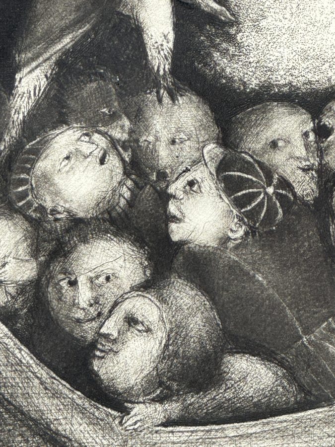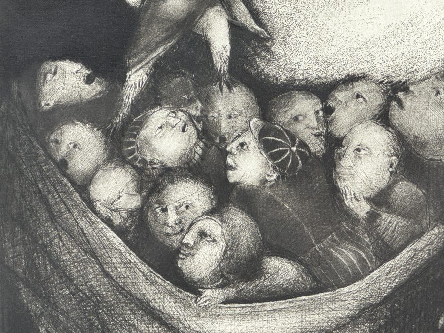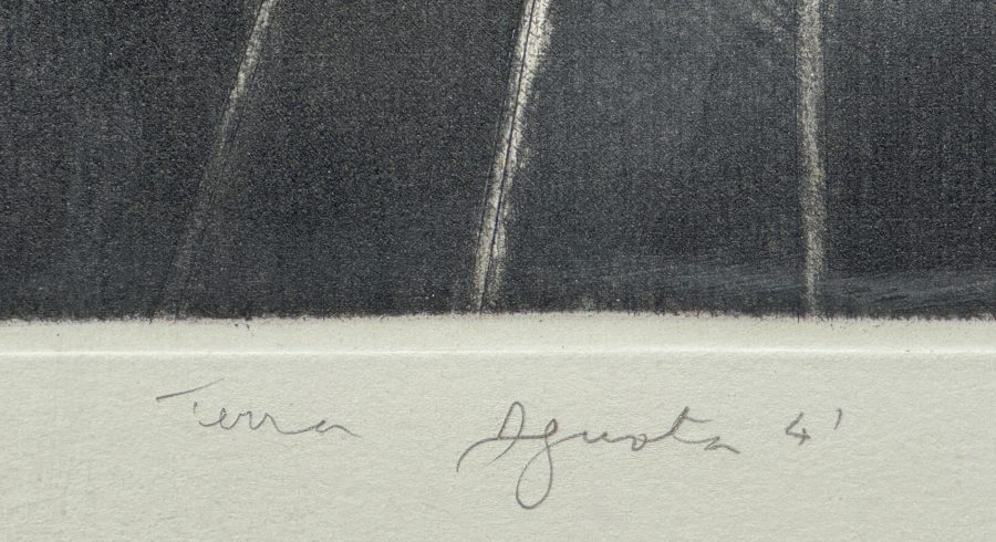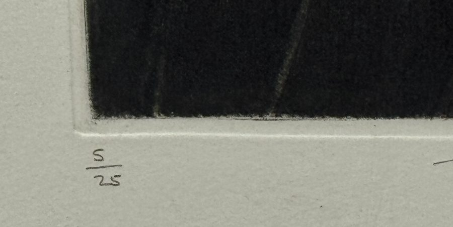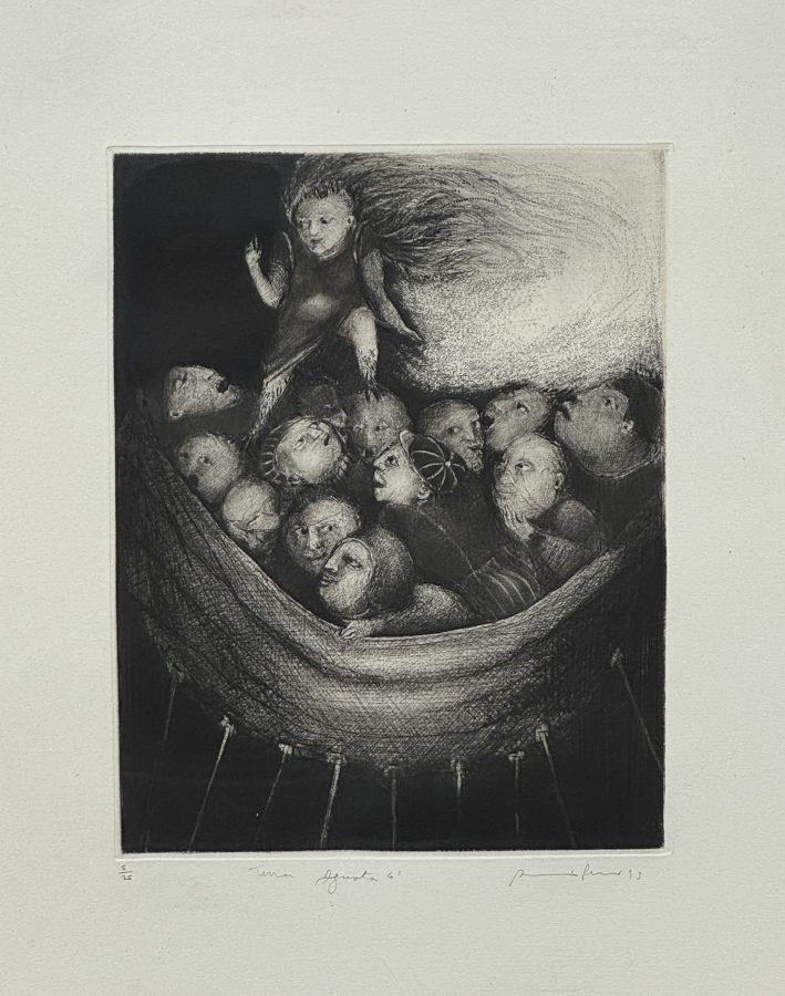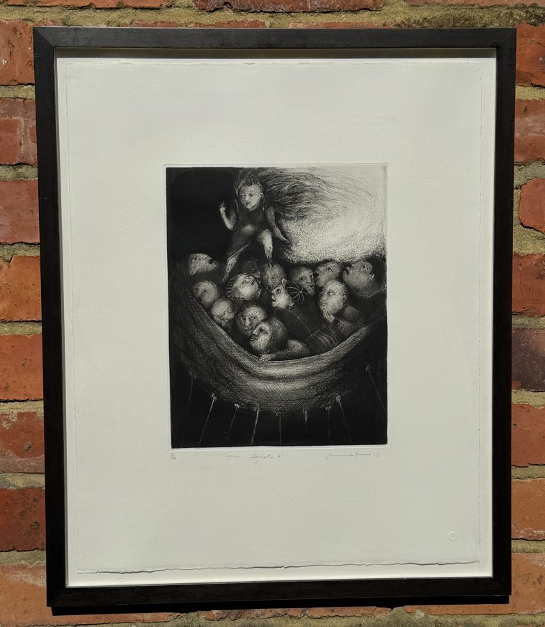Description: Drypoint etching printed on Somerset TP 300gsm paper. Signed, titled, dated and numbered 5/25 in the bottom margin. Terra Ignota sees a recurring theme of journey-making which appears in Pacheco’s work. The gamut of human emotions are captured by the characters found in this boat on stilts. Is it going anywhere? Are they getting anywhere? Where is this journey headed to?