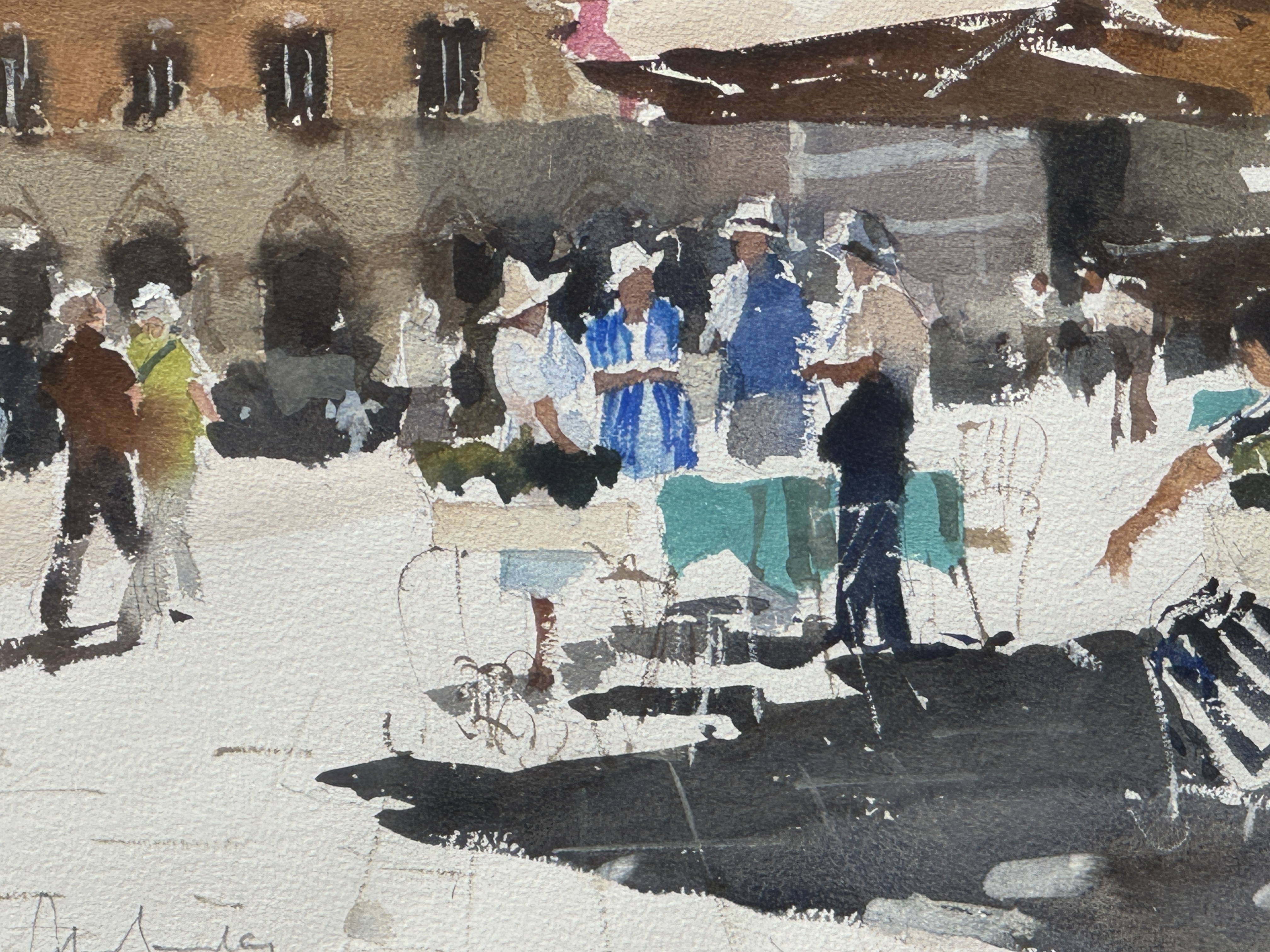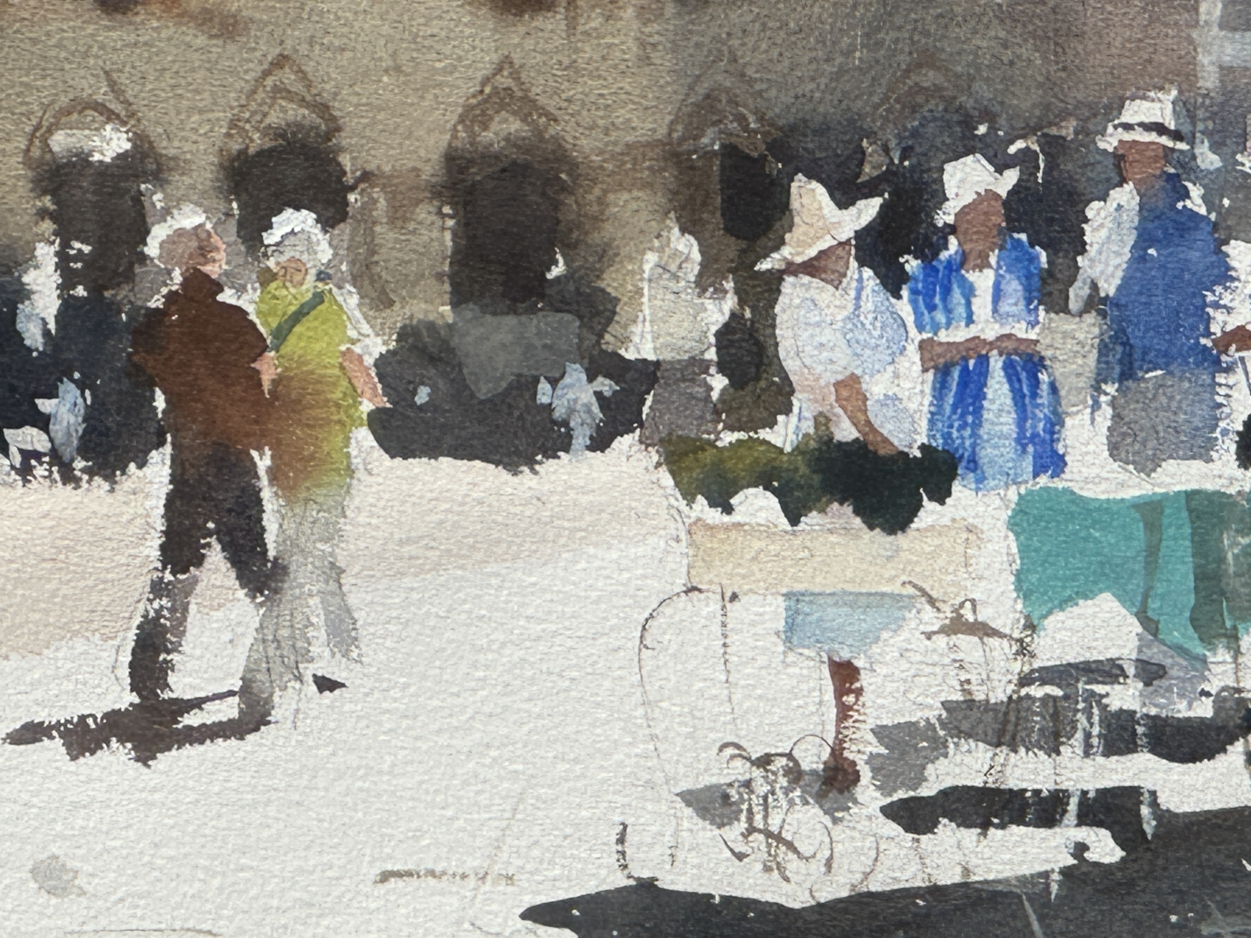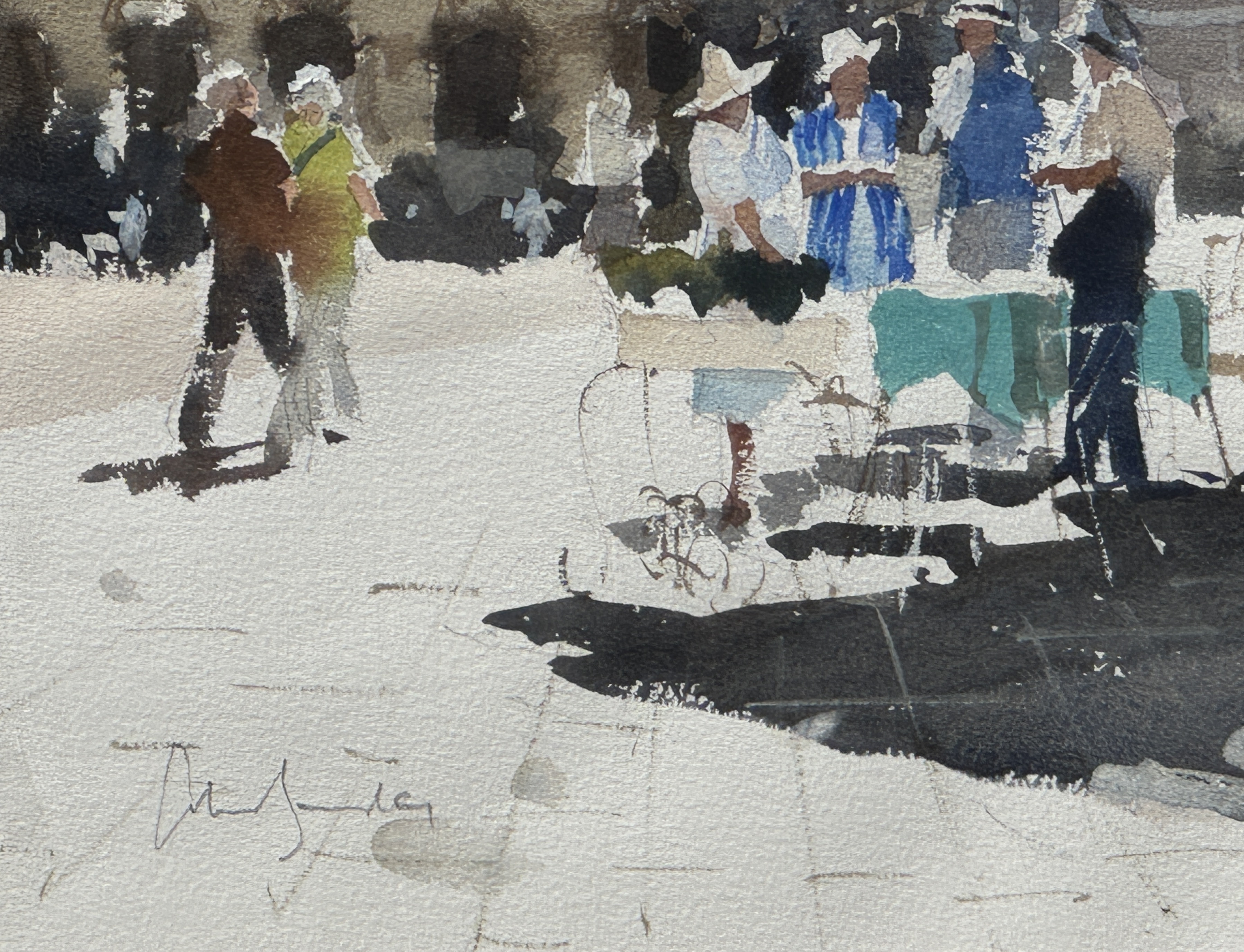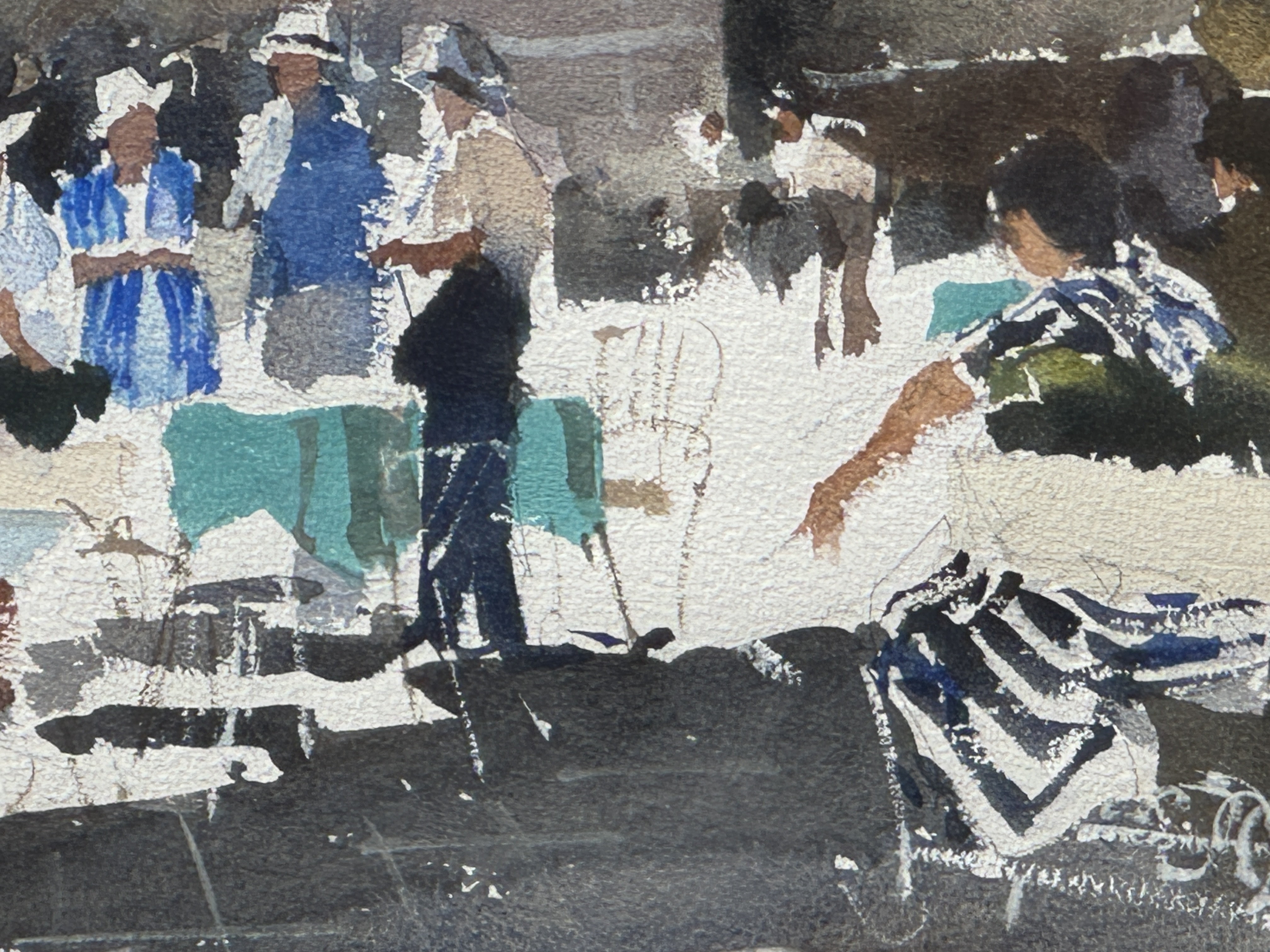 A fresh, light-filled composition, this work captures a moment of everyday life through John Yardley’s characteristically economical brushwork. Figures and setting are suggested with just enough detail, allowing light and colour to carry the scene.