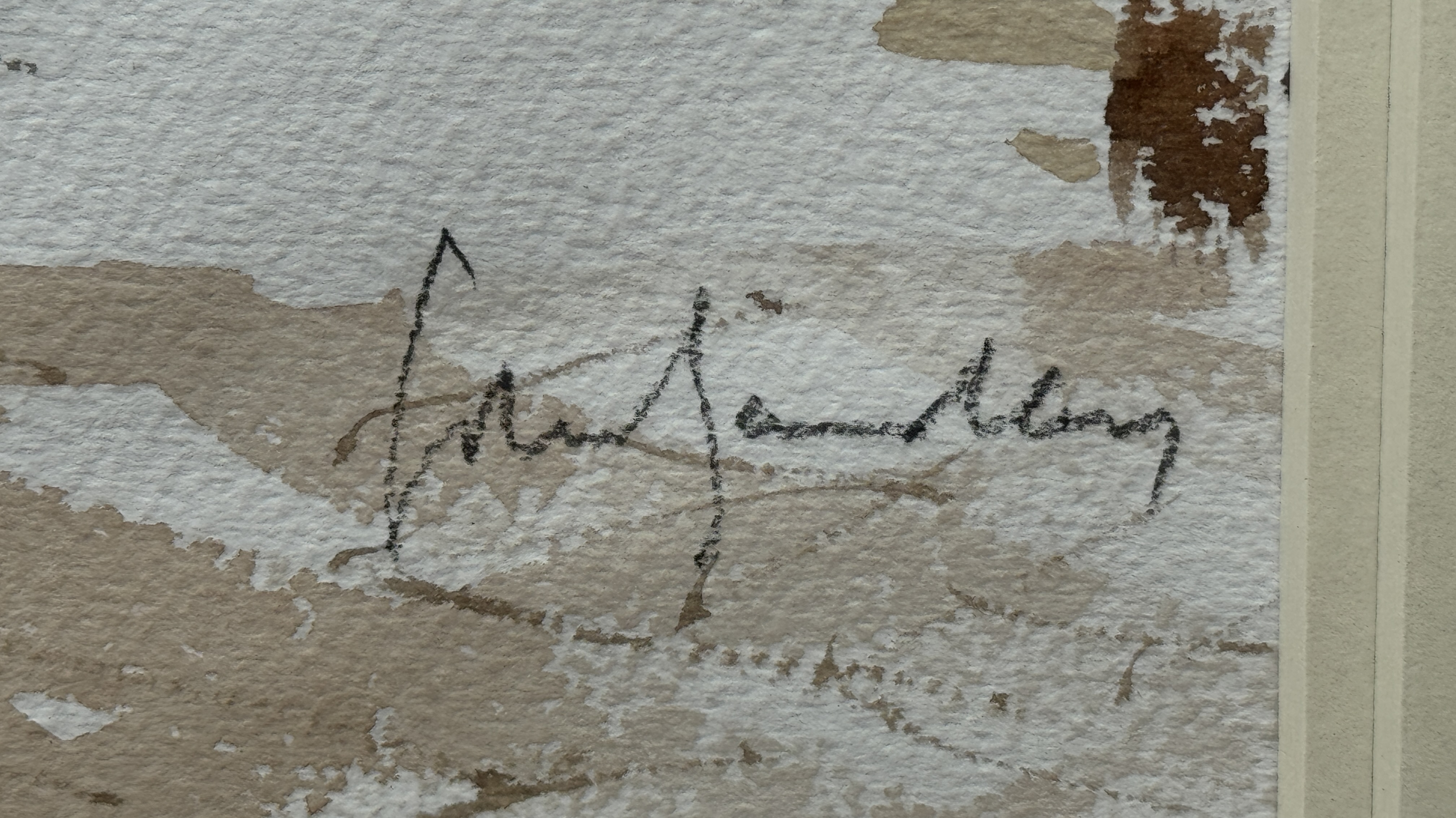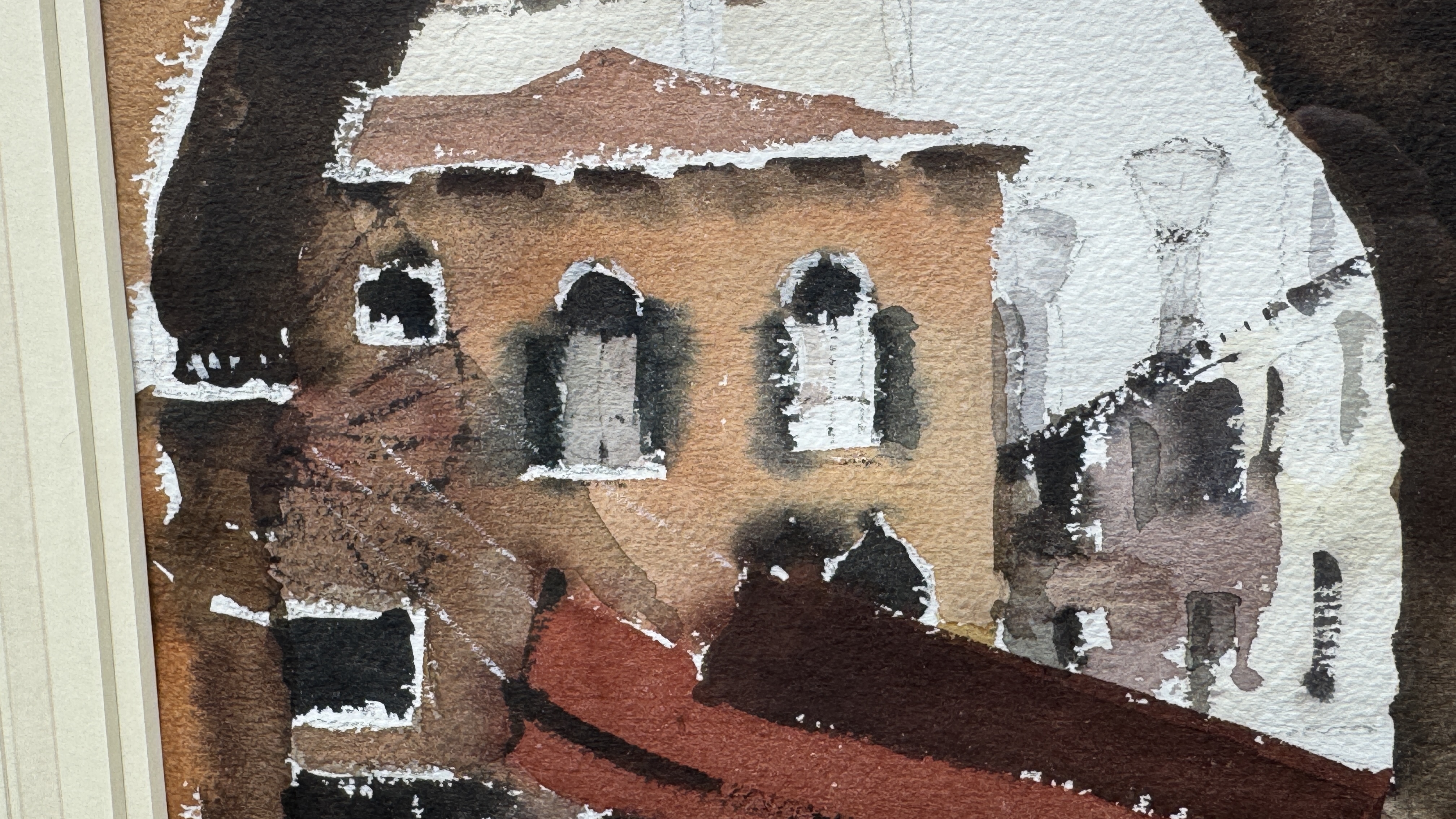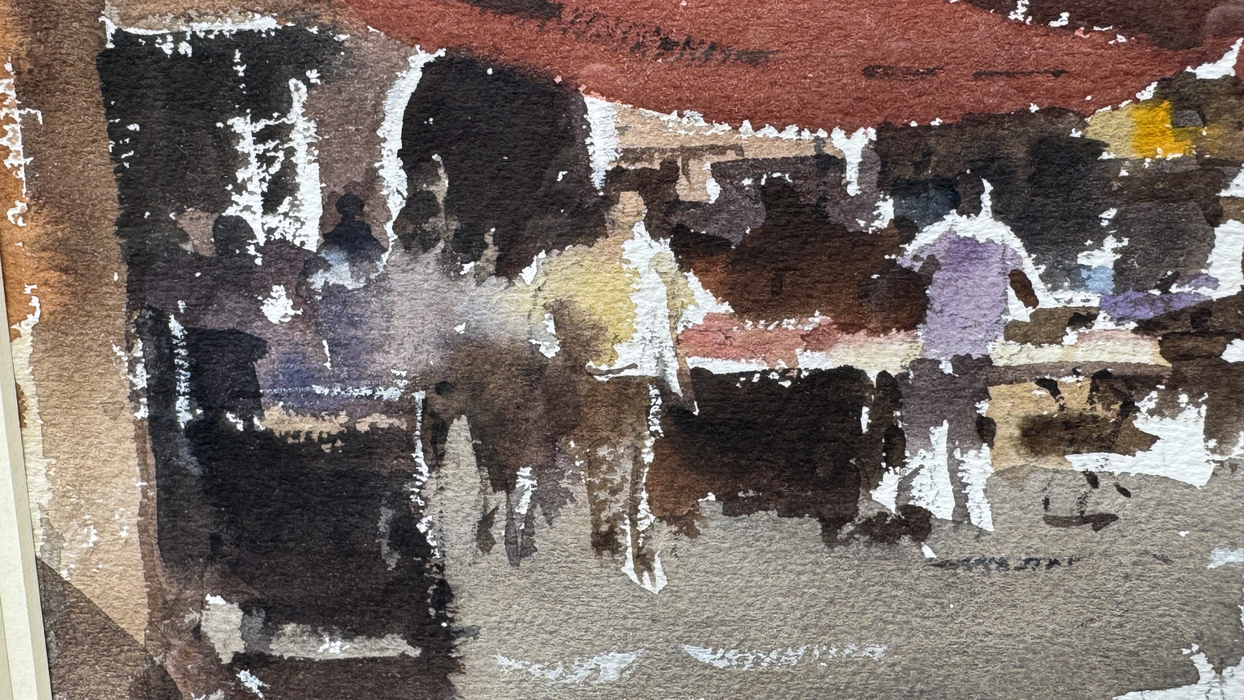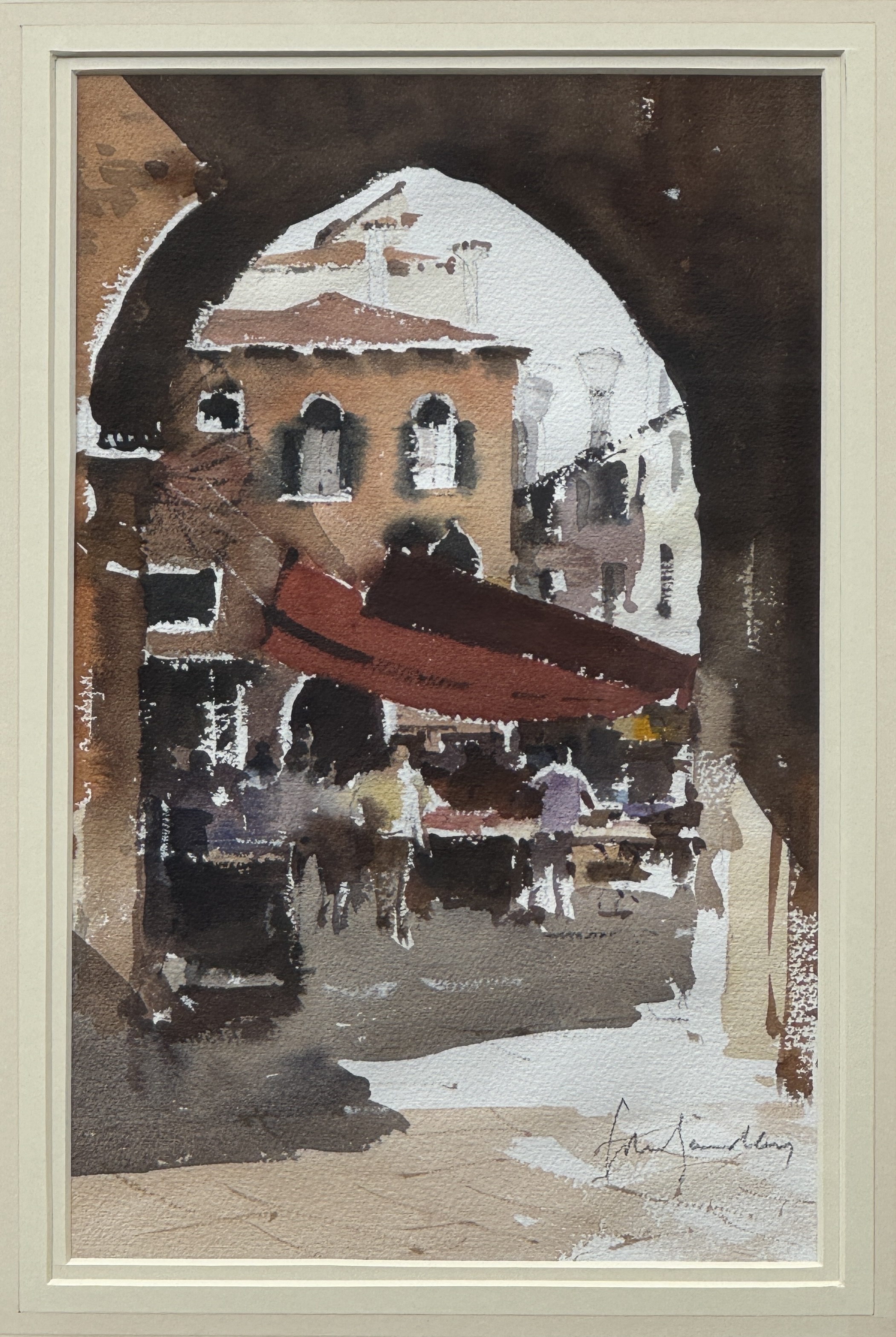 Believed to depict a Venetian setting, the composition is held together through colour and light rather than detail, with the bold red acting as a focal point within the looser surrounding washes. The result is a scene full of movement and atmosphere, typical of Yardley’s southern subjects.