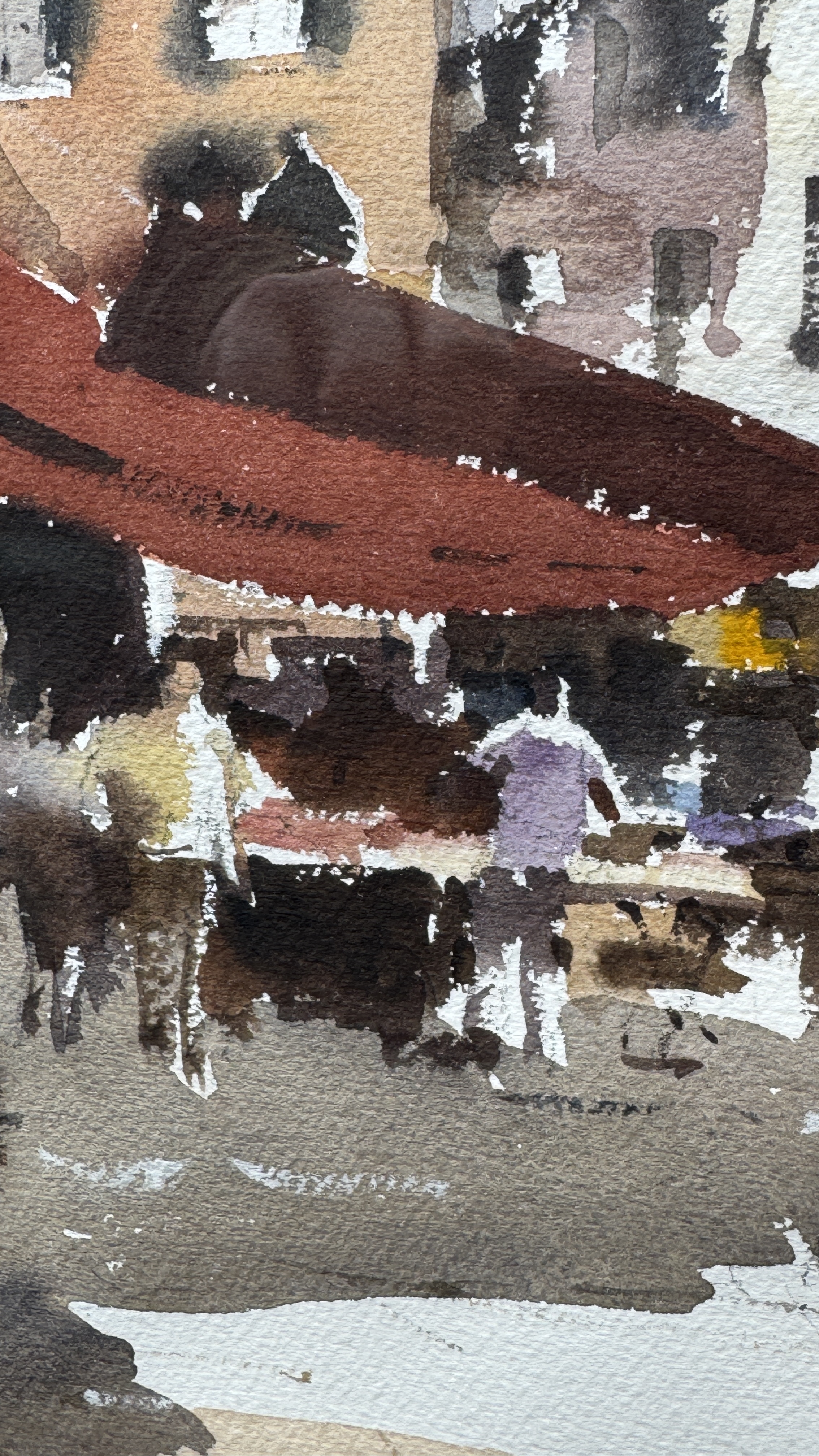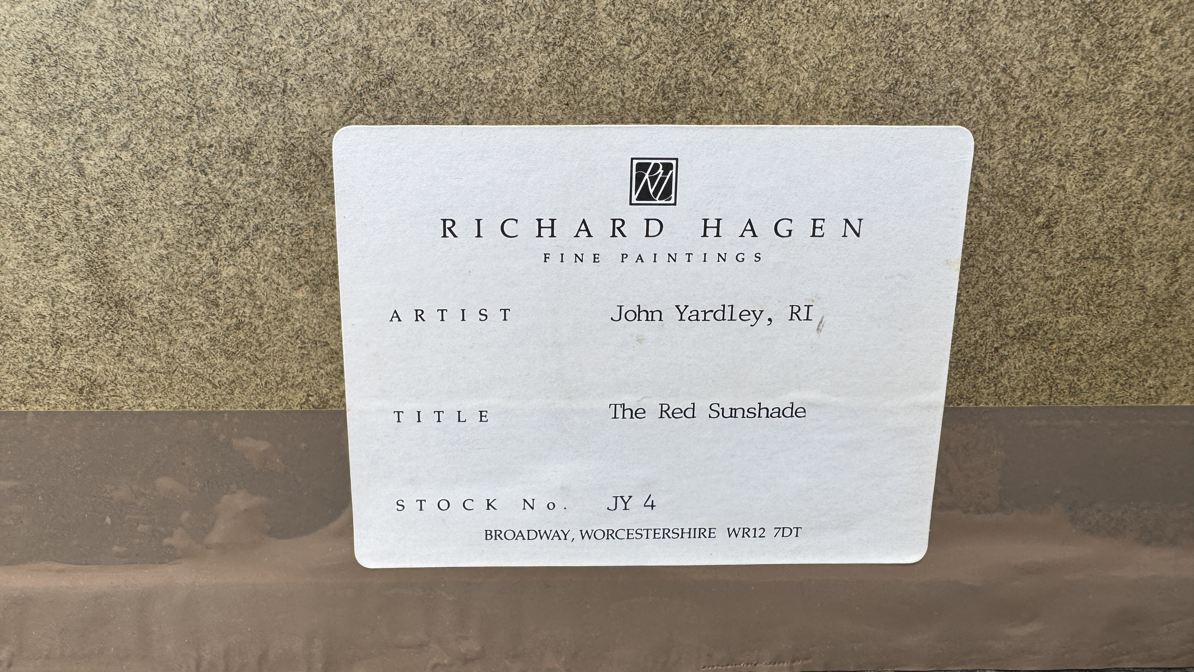 A lively, light-filled composition centred around a striking red sunshade, which anchors the scene and draws the eye immediately. Figures gather and move beneath it, suggested with John Yardley’s characteristically economical brushwork.