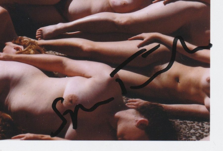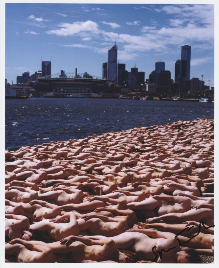 Tunick is an American photographer renowned for his large-scale nude shoots which change the landscape. This signed colour 8 x 10 photograph depicts one of his shoots in Melbourne, Australia, with nude bodies laying on the shore. The original photograph was created in 2001 and is entitled Melbourne 5 (women 35 and over). This is a printed photograph and is not from the edition. It is signed in bold black ink to the lower right corner.